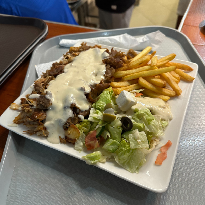 Mięso, sałatka, frytki + marchewką po koreańsku, abo pelyustką, abo bakłażan.